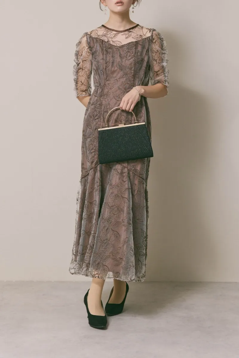 繊細な刺繍チュールのブラウンのドレス。肩とデコルテの程よい透け感が華奢な印象を引き立てながらも、パフスリーブで存在感をプラス。