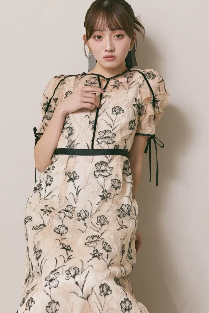 ラインフラワーの配色刺繍が映えるベージュのエンブロイダリードレス。LILYBROWNらしい甘さと個性のバランスの良い一着。
