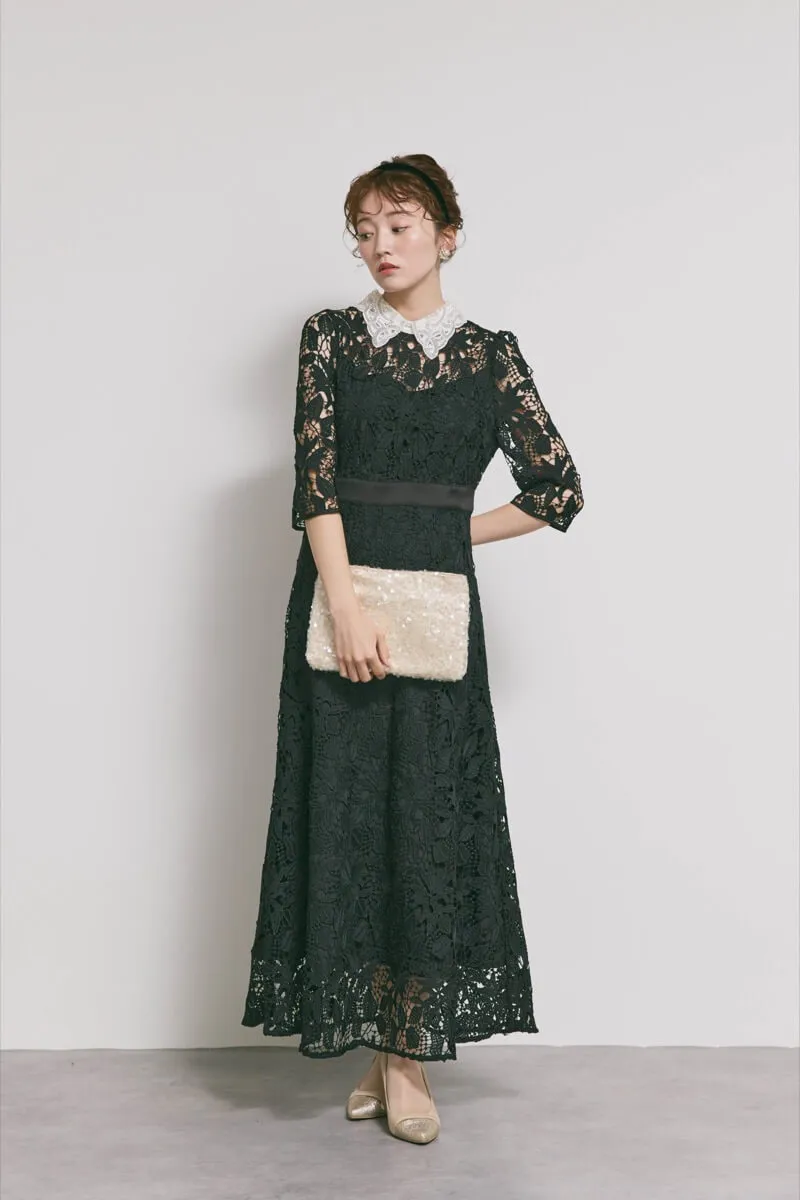 クラシカルなブラックのレースドレス。全体にあしらわれた繊細なレースが上品な印象を与え、特別なシーンをより華やかに彩る。スカラップレースの美しさを引き立てるフィット&フレアのシルエットがポイントです。