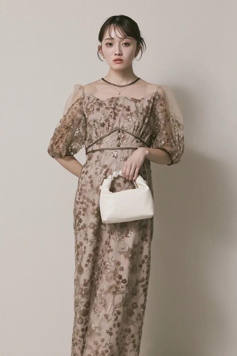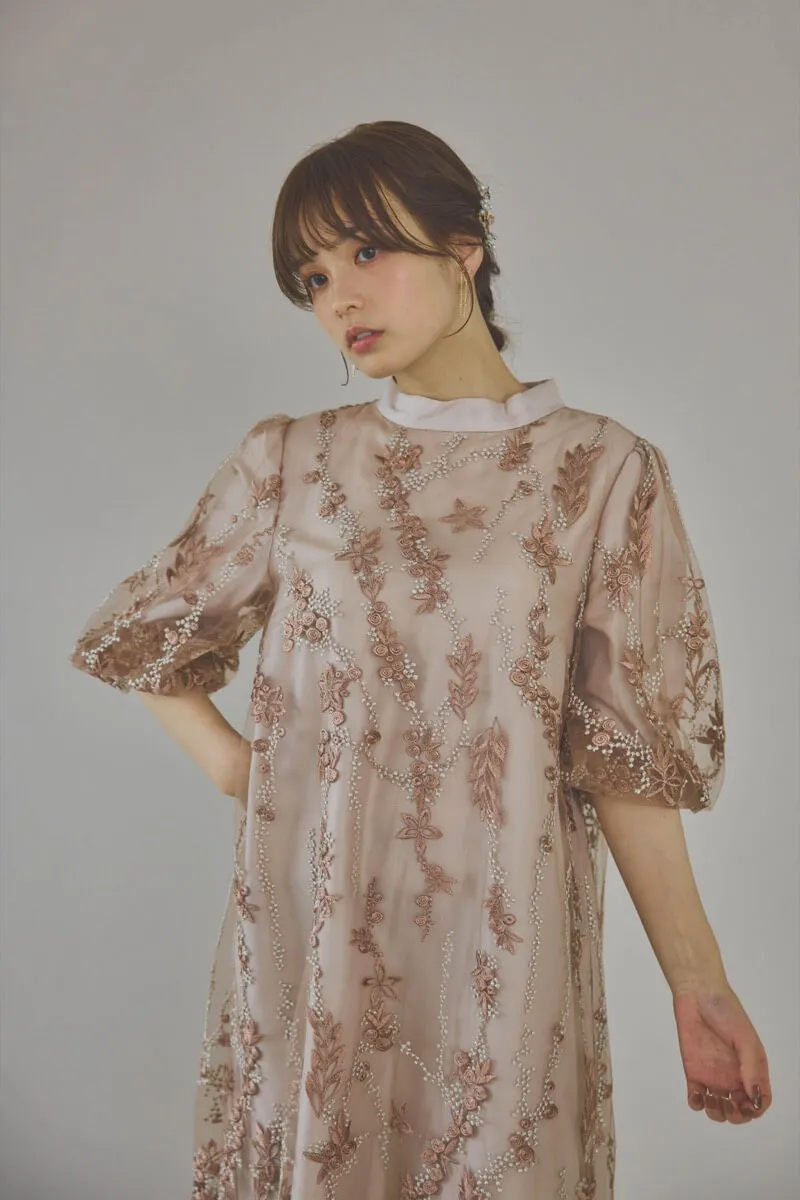 やや張りのあるチュール地に小花柄の刺繍が散りばめられたベージュのボリュームスリーブAラインドレス。裏地がサラッとしていて着心地が良いサテン生地です。