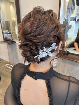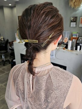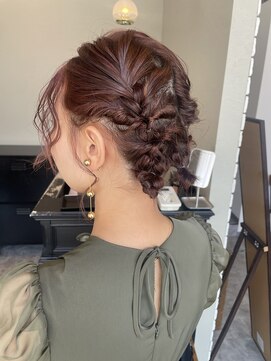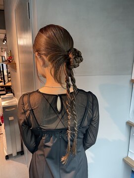 三つ編みを取り入れたまとめ髪で、長さのある髪もすっきり好印象に。