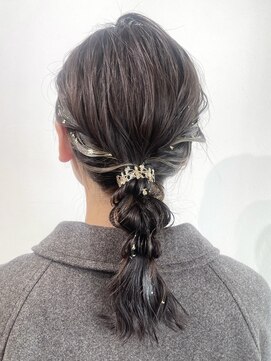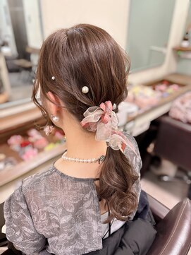 毛先を遊ばせると動きが出て華やかエアリーなプチポニー。