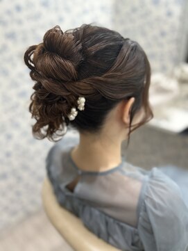- 髪は全体にゆるく巻き、サイドを残して低めの位置でまとめる。