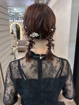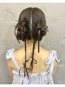 毛先はお団子にまとめた大人っぽいツインアレンジ。