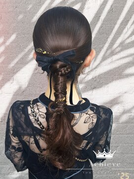 カチモリと三つ編みを垂らして動きのあるスタイル。