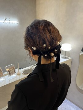 パールピンを散りばめてリボンをアクセントにしたハーフアップ。