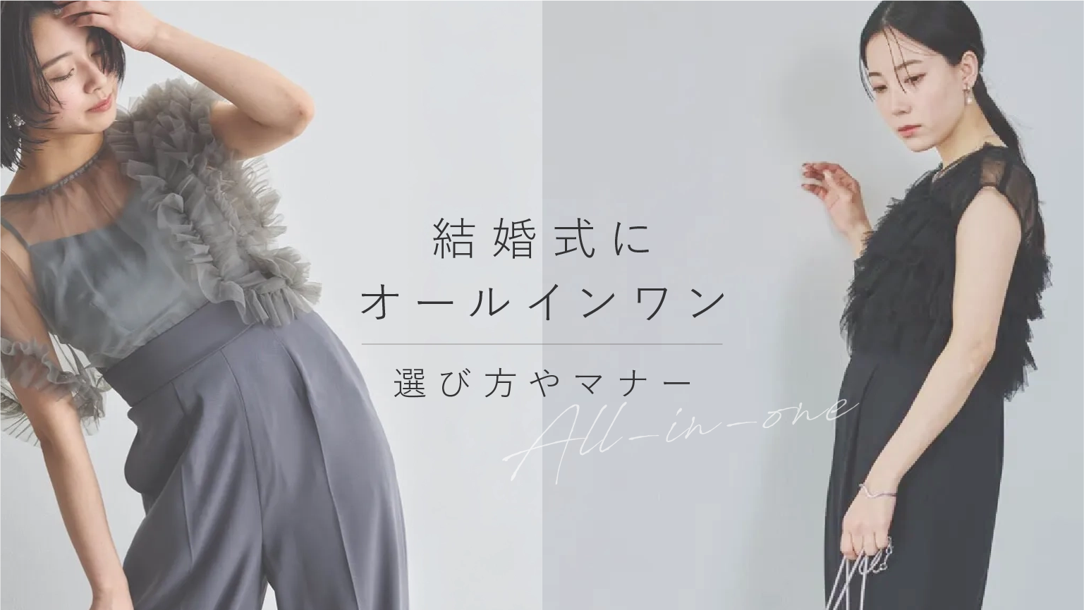 結婚式にふさわしいオールインワンの着こなしを、クールな着こなしと大人フェミニンの2タイプに分けて紹介します。
