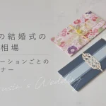 和の意匠によるこだわりを取り入れた会場だからこそ、派手すぎる服装は場の雰囲気に合わずに浮いてしまうので、淡い色味やくすみカラーなどのドレスを選んでみましょう。