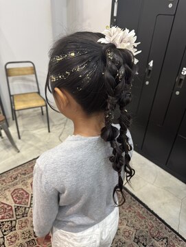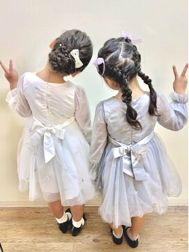 ハーフアップやまとめ髪は、ドレスやワンピースと相性がよい髪型。七五三らしい特別感も演出できます。