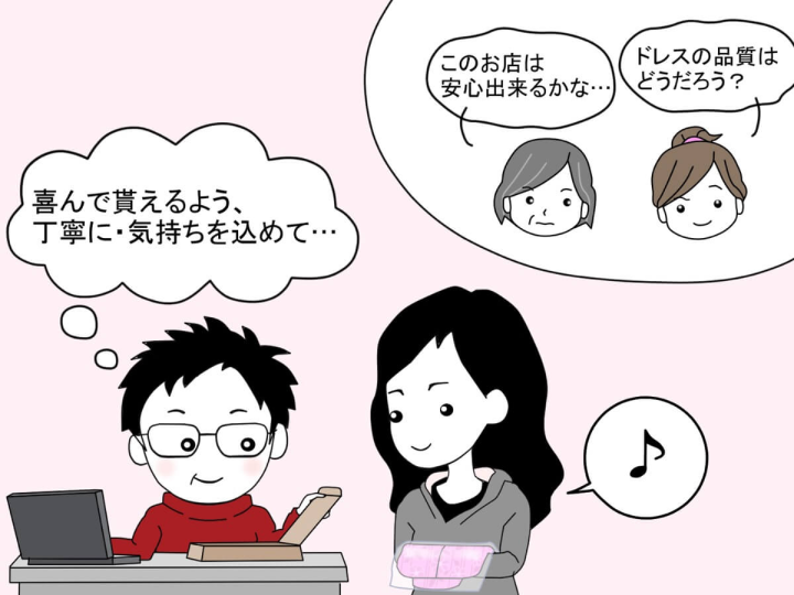 ワンピの魔法は、ドレスの押し売りをすることではなく「お客様のために、心のこめた接客をする」ことを大切にしています。