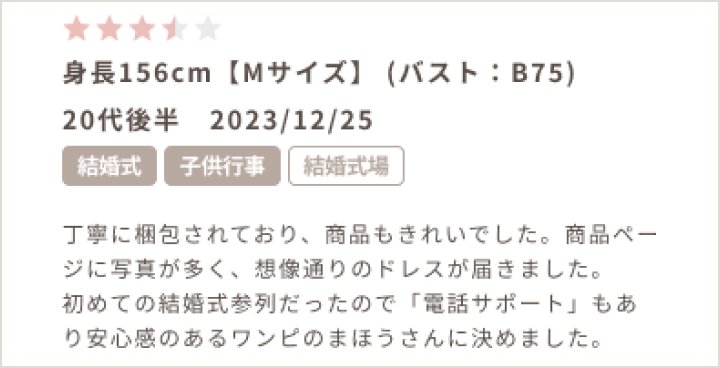 各商品ページに「このドレスは30代の方におすすめ」などというスタッフのコメントを載せ、どの年齢の方でも安心して商品を選べるように努めてます。