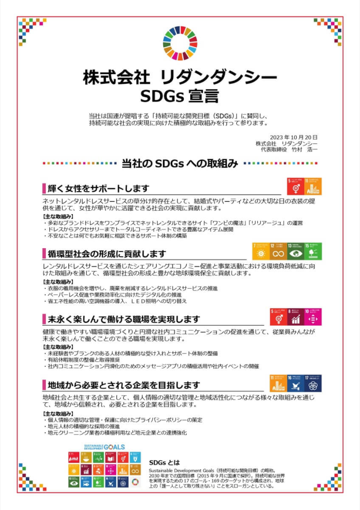 ドレスを借りるということを通じて、自分の存在や居場所を感じられる、気持ちが明るくなるような、皆様にとってお気に入りの場所(お店)となることを目指しています。
