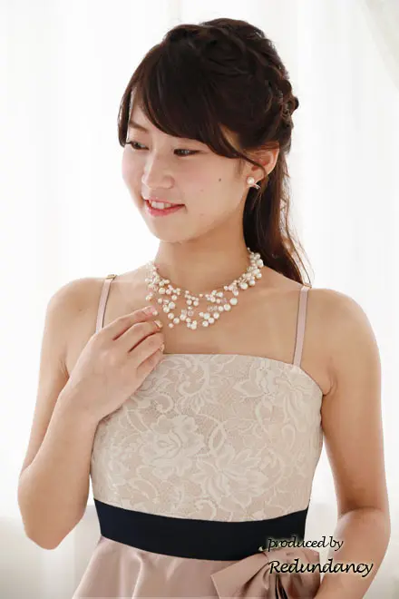 ウエストの切り替えがネイビーなので、同色のネイビーのボレロとバッグを合わせると全体がまとまる。大人っぽくまとめるなら靴やバッグを黒でまとめるのがおすすめ。付属のリボンがついているのでウエストのポイントとしても使え、簡単に取り外しが可能。胸元に少し開きがあるので大ぶりのネックレスが良い。