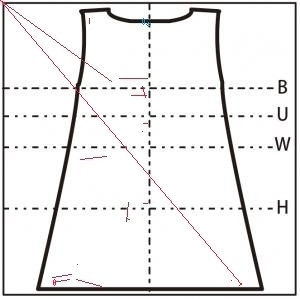 - スカートすそ付近に 15cm の横の糸つれ