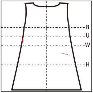 - スカート右側寄りに 15cm の縦の糸つれ