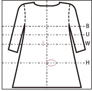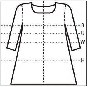 胸周り、お腹周りはゆとりがある。腕まわししやすく、二の腕が隠れて目立ちにくい。丈はひざ丈。