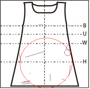 - スカート左側寄りに 直径8cm の縦の糸つれ