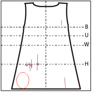 - スカート右側寄りに 6.5cm の縦の糸つれ