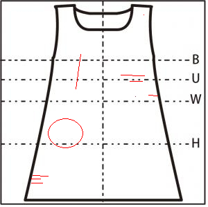 - スカート左側寄りに 14cm の横の糸つれ(5cm.10cm.14cm 3ヶ所)