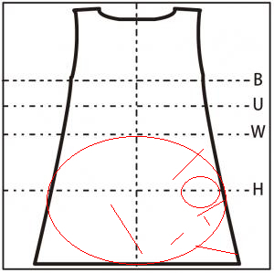 - スカートすそ付近に 25cm の縦の糸つれ