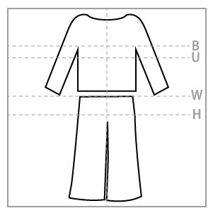 トップス:首周り、肩周りはちょうど良い。パンツ:ウエストがやや大きく、丈が長めなので一折すると丁度良い。