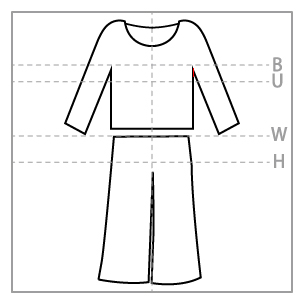 トップスレースはゆったりとしたシルエットでストレスフリー。パンツはウエストにゴムが入っているのでぴったりと着られるが、ファスナーがないので、ヒップの大きい方は着脱に注意。パンツはくるぶし丈でちょうど良いサイズ感。