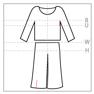 パンツはかなり大きいが、トップスはふんわりとしたデザインなのでバランス良く着られる。パンツ丈はくるぶし丈でちょうど良い。パンツウエスト部はゴム入りなので着心地が楽。