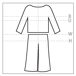 首周り、肩周りはピッタリ。袖は一折りするとバランスが良い。パンツはウエストがやや緩く、着丈が長めなので一折りすると丁度良い長さで着られる。ウエストにゴム入りで着心地が良い。