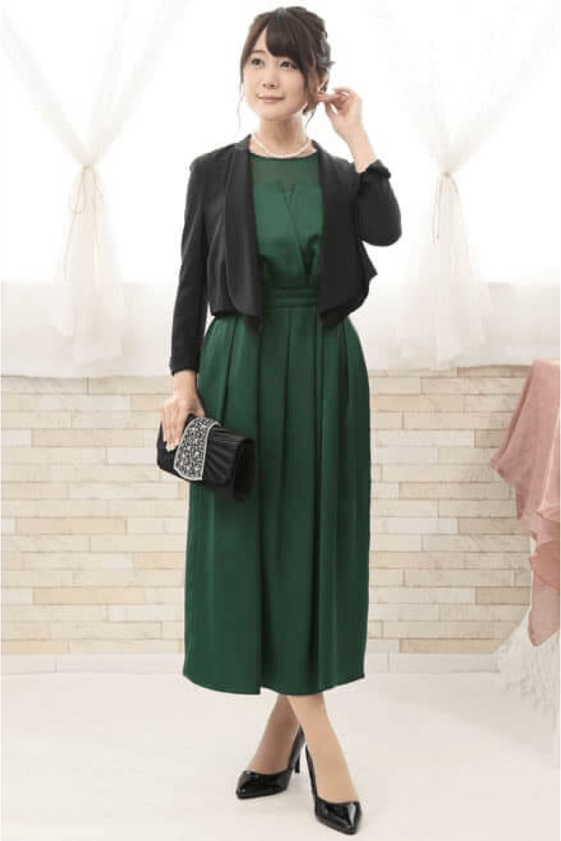 秋冬にぴったりのグリーンのドレスの中でも、こっくりとした深いグリーンは秋の結婚式の定番の色。