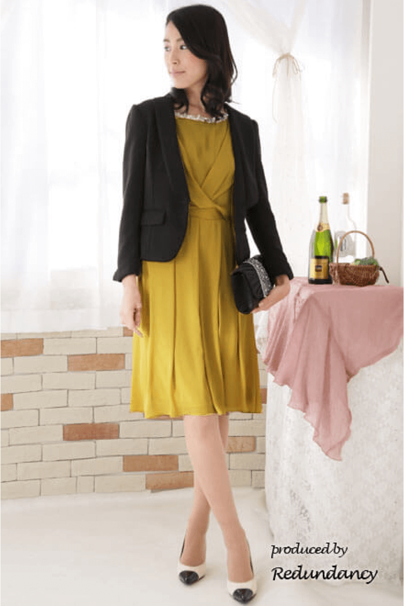 黒のボレロを羽織り、靴とバッグも黒でまとめるとメリハリのある凛としたクールさが生まれる。ノーブルに着こなしたい時は、同系色のゴールドをストールをさらりと羽織るのがおすすめ。