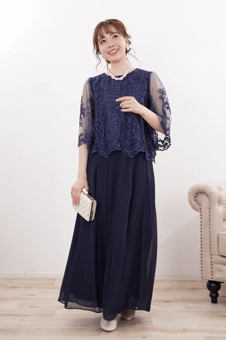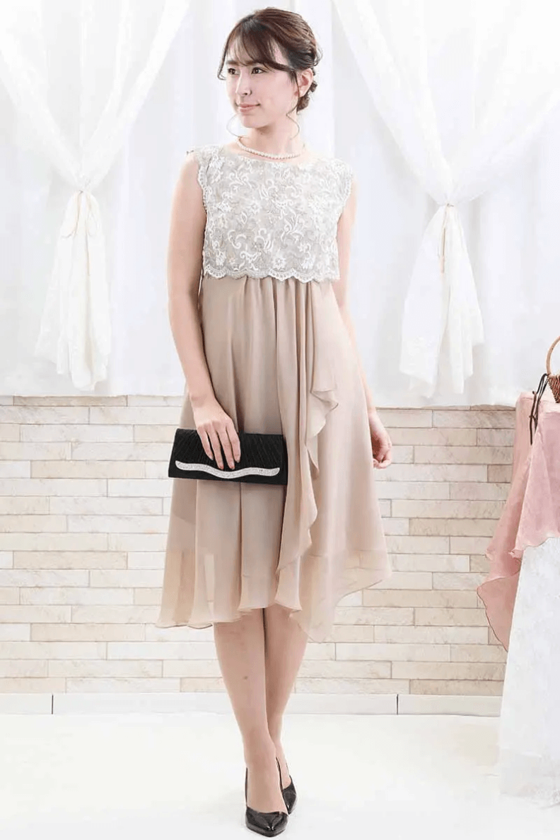 程よい透け感が上品で、年代問わず着こなしやすいシフォン素材のパーティードレス。