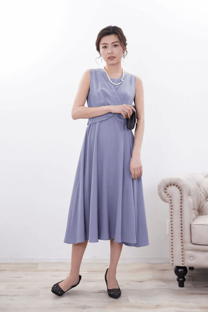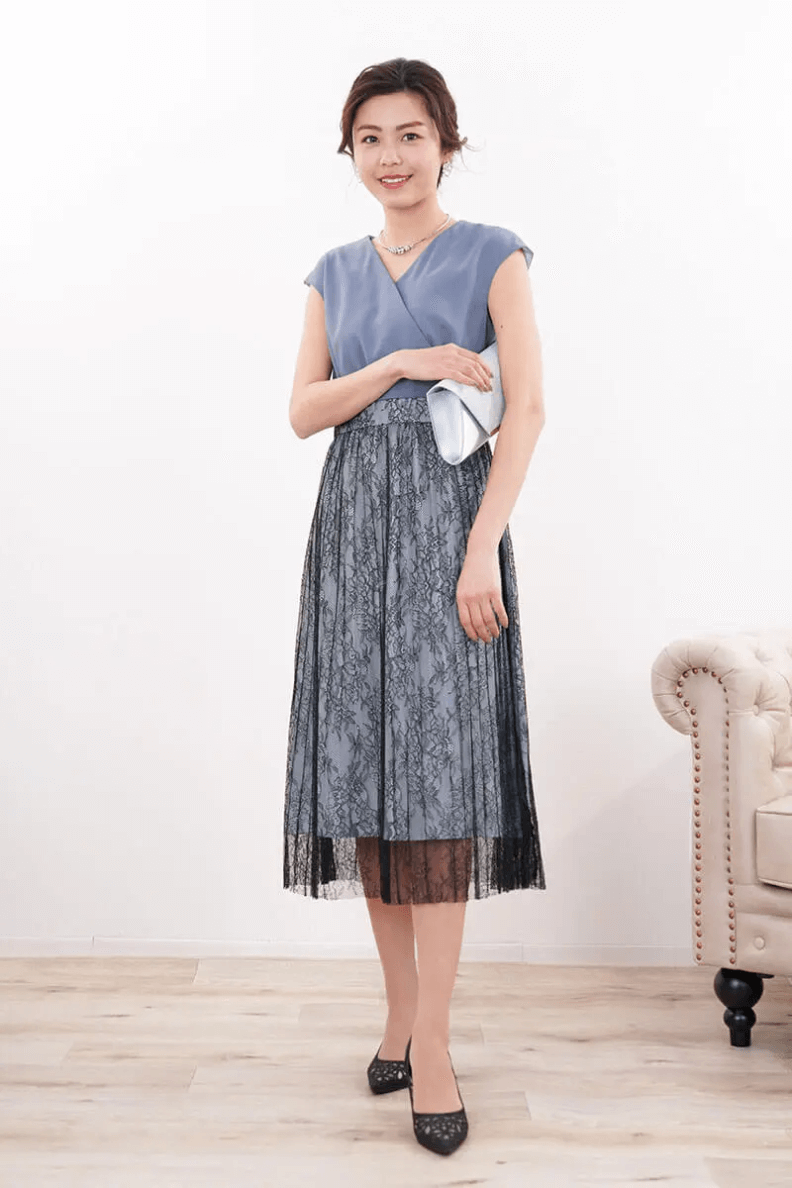 大人っぽくシャープなイメージで着こなしたい方は濃いめのブルー、可愛らしく爽やかに着こなしたい方は淡いブルーのドレスがおすすめです。またブルーグレーなど、くすみ系カラーを選べばトレンド感UP。