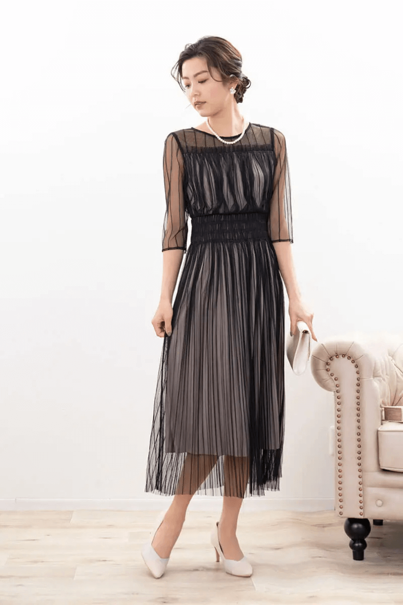 また、小物類はライトカラーを選び華やかさをプラスして。特にネイビーにはシルバー系、ブラックにはゴールド、ライトベージュを合わせたスタイルがおすすめです。シンプルなドレスには、パールやビジューをあしらった大きめアクセやバッグをコーデのポイントに。羽織を合わせる場合は、透け感のあるラメストールなどで軽さを意識して。