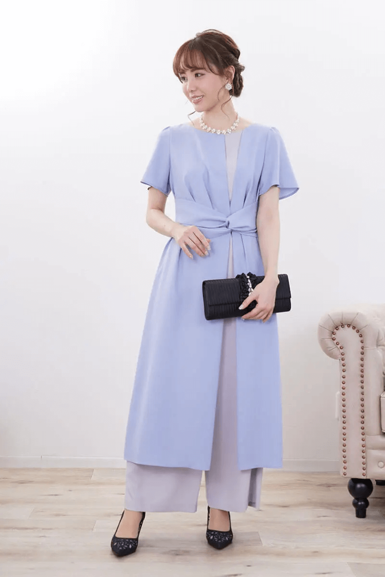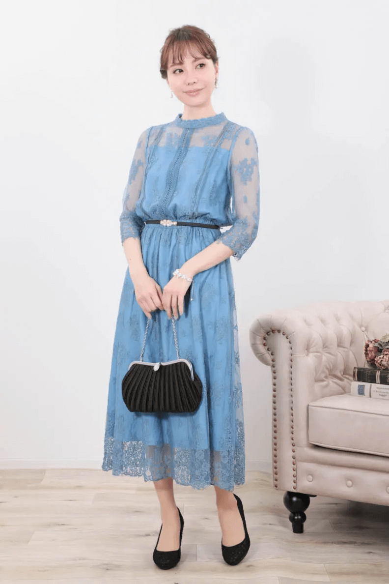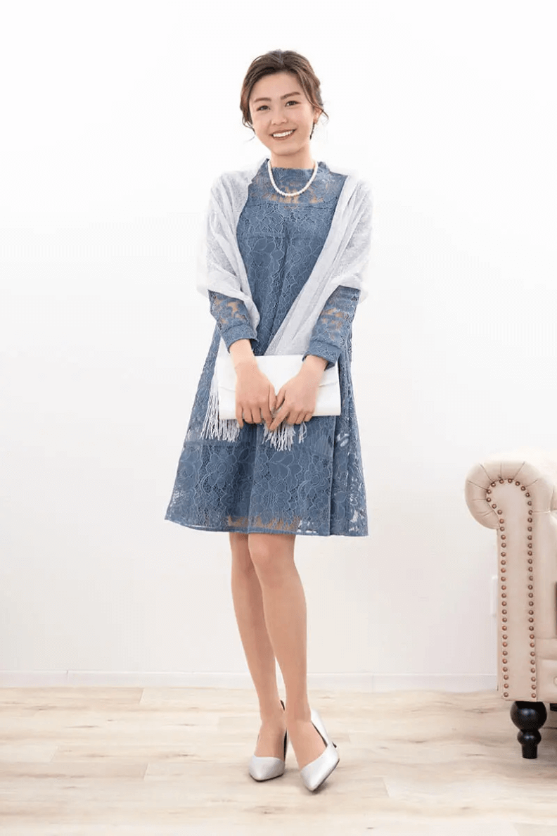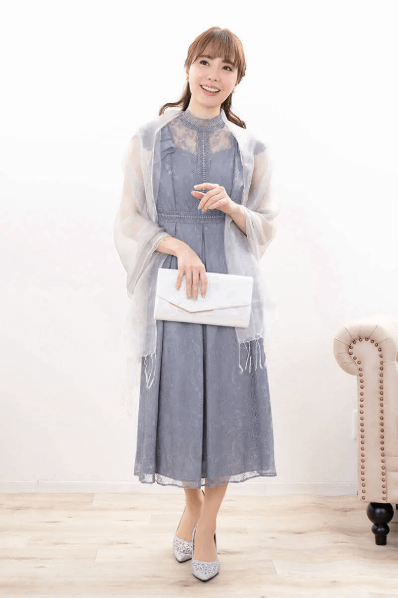 夏に濃いめのブルーやくすみ系ブルーのドレスを選ぶ場合は、シルバーの小物類を合わせた涼しげなスタイルがおすすめ。また、ライトベージュを合わせると女性らしく柔らかな雰囲気にまとまります。羽織を合わせる場合は、コーデ全体が重たくならないように透け感のあるストールを合わせて。シルバーの他、淡いゴールドも◎