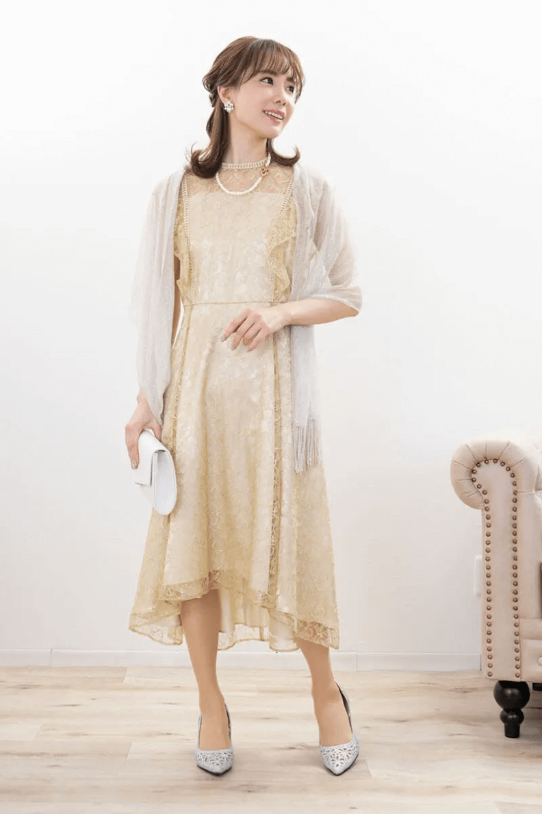 夏に着る際は透け感のあるレースやチュール素材のドレスを選べば、重たくならず涼しげな印象をキープできます。>